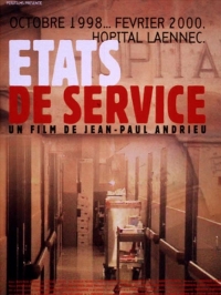 États de service a été tourné dans une unité de cancérologie à l'hôpital Laennec, entre octobre 1998 et février 2000, avec la participation des malades et de leurs proches, des médecins, des cadres infirmiers, des infirmières et de l'ensemble du personnel soignant. Nous voyons ici la médecine en train de se faire avec ses difficultés, ses paris, ses limites, ses échecs, ses réussites. Parce que la mort est un horizon possible, les malades occupent dans le film une place essentielle. Mais la fragilité des êtres humains, ce n'est pas seulement la leur, c'est aussi celle des médecins et des infirmières. Comme les patients, ils mènent un corps à corps quotidien contre la maladie, dans lequel apparaissent aussi bien leur compétence et leur pugnacité que leurs doutes et leur vulnérabilité. Ils ne sont pas au-dessus des questions posées par le film, mais au coeur de celles-ci. États de service nous parle d'une maladie, le cancer, qui renvoie aux fêlures fondamentales, aux grandes angoisses et aux combats souterrains de l'être. Mais ce n'est pas un film sur le cancer, il va au-delà par les réflexions et les interrogations qu'il fait naître sur le sens de la vie.